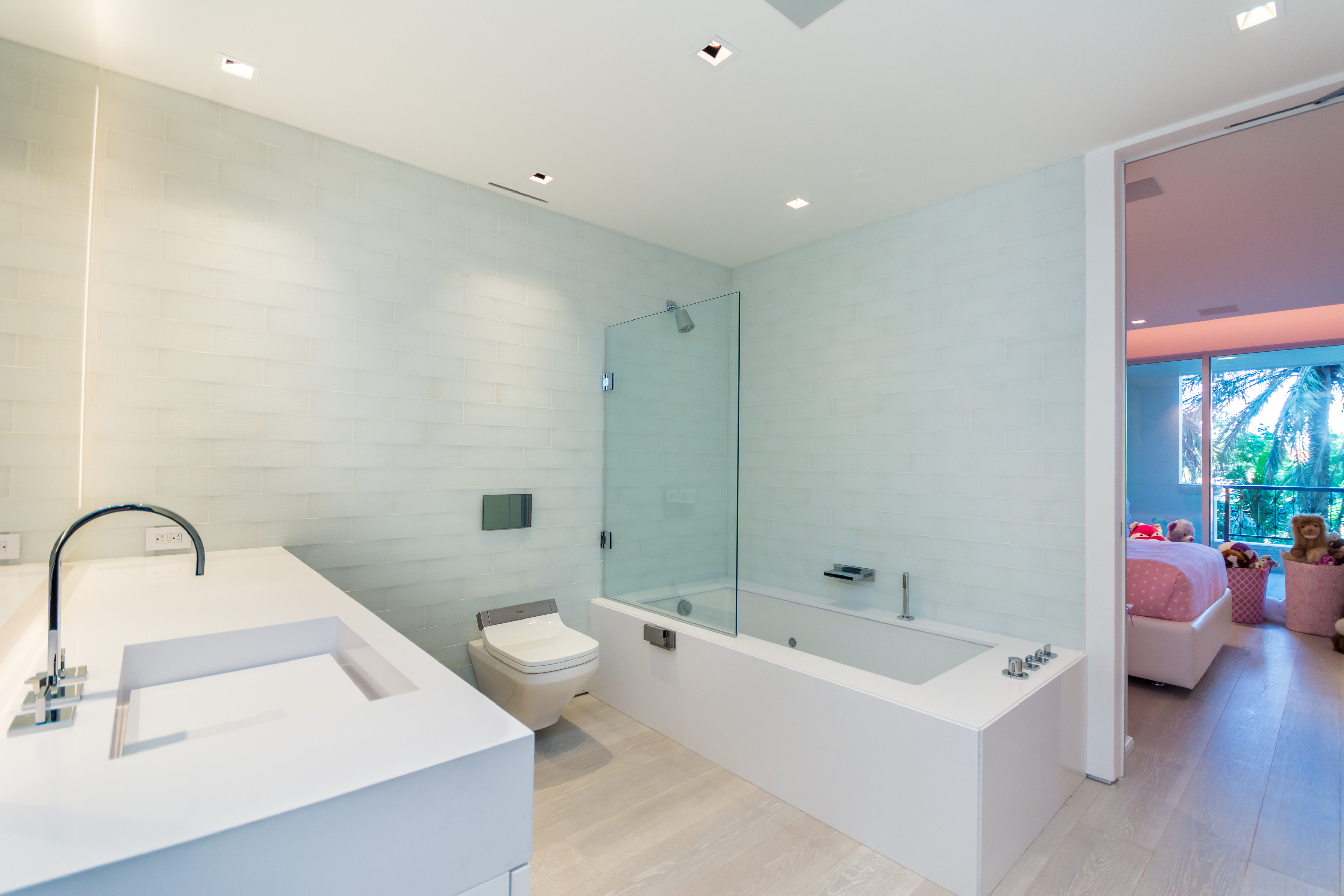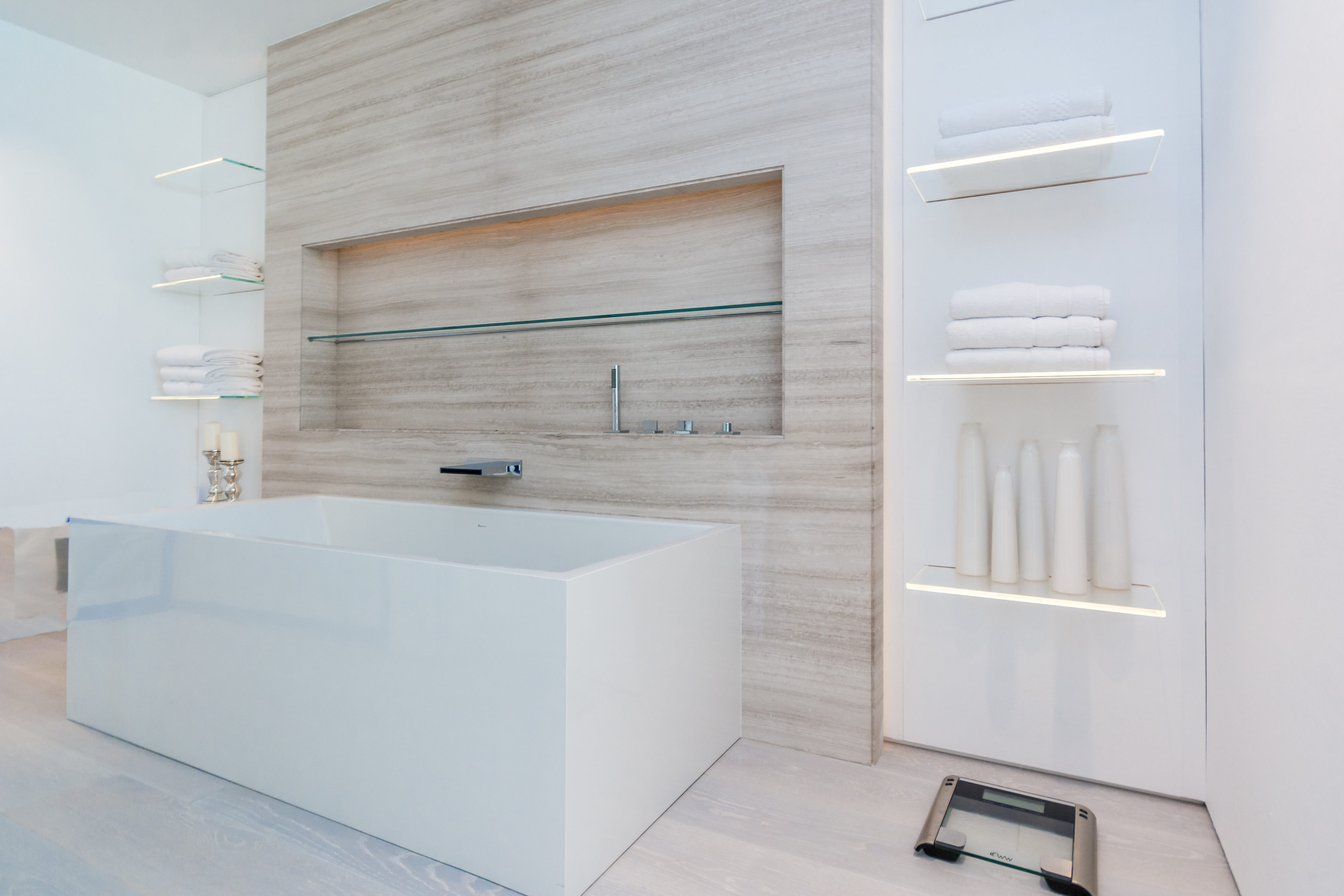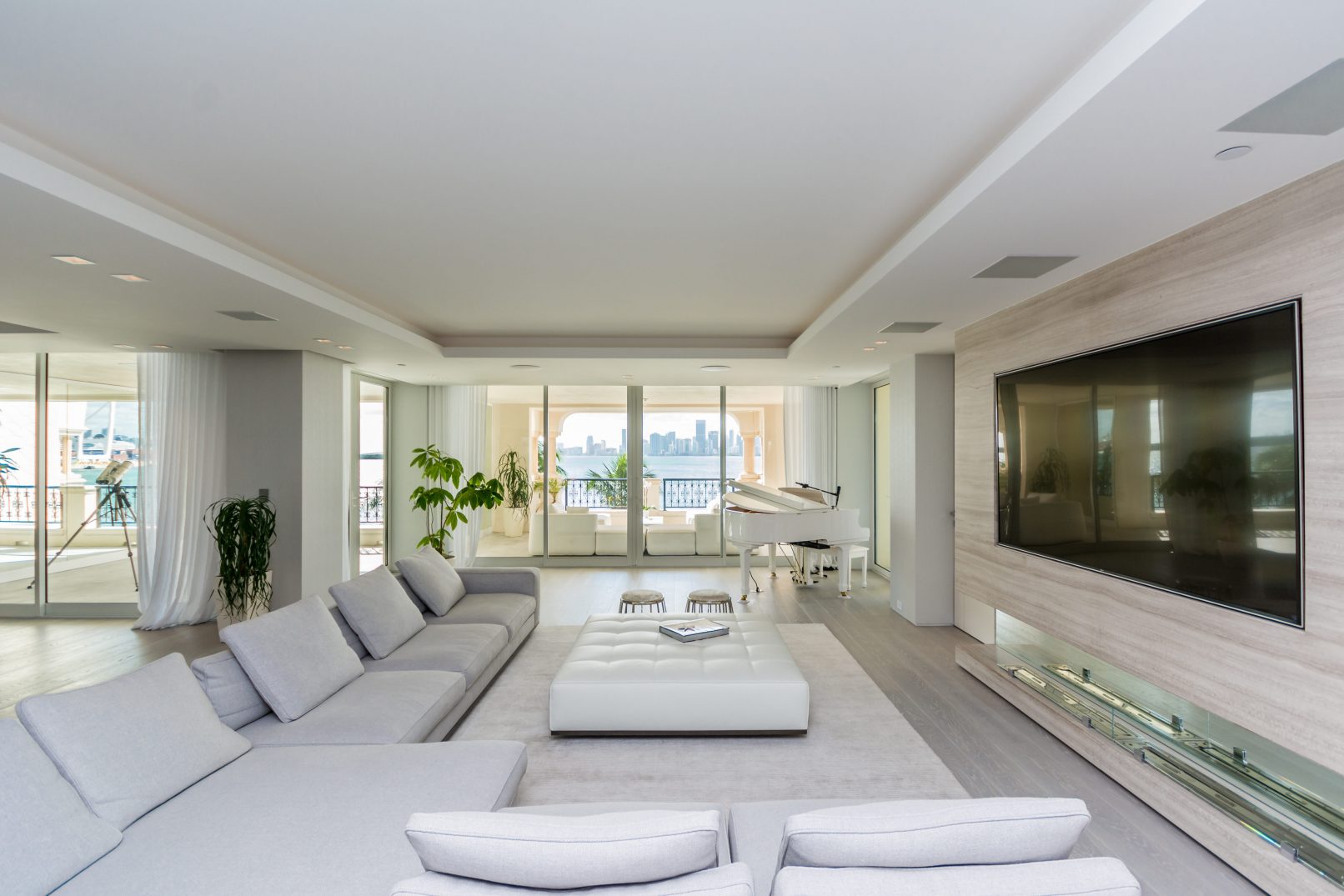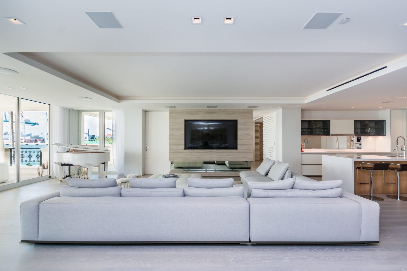 We recently completed a beautiful full renovation to a Bayside Unit. The vision was a beach feel executed with elegance and sophistication. The ultra-modern design is dominated by clean, bright white with lighting and other elements evocative of its waterfront locale. Augusto Busnelli specified multiple materials combining earth tone leathers with two-tone stitching, along with lots of glass and inox. Beautiful custom-stained wood flooring was designed to match the Master and specialty doors. This creates a seamless flow throughout the unit, extending onto the terrace, where the owners relax to a stunning downtown Miami view.